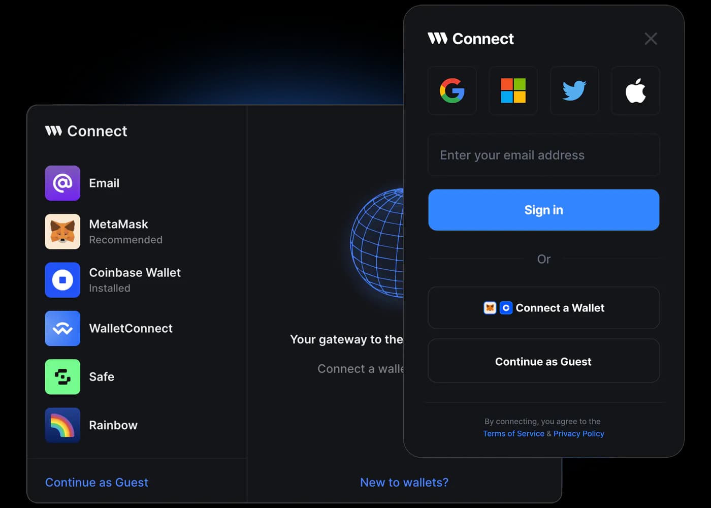 ConnectWallet component renders a button which when clicked opens a modal to allow users to connect to various wallets. It is extremely customizable and very easy to use.